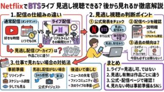 暮らし NetflixでBTSライブは見逃し視聴できる?後から見れるか徹底解説 NetflixでBTSの生ライブが配信されると聞いて、「見たいけど仕事でリアルタイム視聴ができない…」と悩んでいませんか?ライブ配信は通常の作品と違い、後から見れるのかどうかが分かりづらく、不安に感じる人も多いです。特にBTSのような人気ア... 暮らし