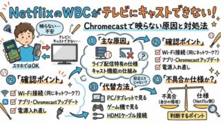 イベント NetflixのWBCがテレビにキャストできない!Chromecastで試合が映らない原因と対処法 NetflixでWBCの試合を見ようとしたのに、「スマホでは再生できるのにテレビにキャストできない…」という状況で困っている方も多いのではないでしょうか。特にChromecastを使って普段は問題なく映画やドラマをテレビで見ている場合、スポ... イベント