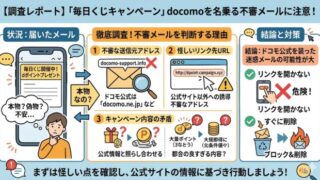 IT 「毎日くじキャンペーン開催中」は迷惑メール?docomoを名乗る不審メールを調査 「docomoから毎日くじキャンペーンの案内が届いたけれど、本物なの?」そんな不安を感じた方も多いと思います。今回のメールは、一見するとdポイント関連の案内に見えますが、送信元メールアドレス・リンク先URL・キャンペーン内容を確認すると、ド... IT