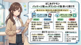 暮らし ぽこあポケモンはパッケージ版とダウンロード版どっち?違いと選び方を解説 この記事では、ぽこあポケモンを購入するときに迷いやすい「パッケージ版とダウンロード版のどちらを選べばよいのか」という疑問について解説します。どちらの購入方法でもゲーム自体は同じように遊べますが、使い勝手や管理方法には違いがあります。事前にそ... 暮らし
