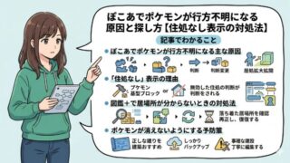 暮らし ぽこあでポケモンが行方不明になる原因と探し方【住処なし表示の対処法】 ぽこあでポケモンの住処を広げたりブロックを壊したりしたあと、「ポケモンが突然いなくなった」という状況になることがあります。特に図鑑+で居場所を聞いても「分からない」と表示され、ポケセンの環境レベルでも「住処なし」と出ていると、消えてしまった... 暮らし