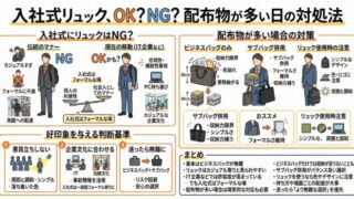 暮らし 入社式にリュックはNG?配布物が多い場合の正しい対処法を解説 入社式を目前に控え、「リュックで行っても大丈夫なのか」と悩んでいる方は少なくありません。特に近年はビジネススタイルが多様化している一方で、入社式のようなフォーマルな場では従来のマナーも気になるところです。さらに、事前に大量の配布物があると分... 暮らし
