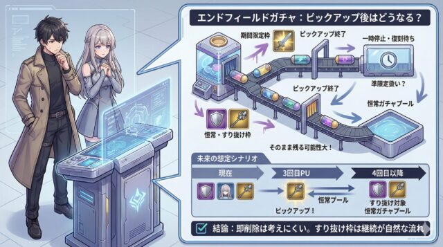 結論としては、ピックアップ終了後にキャラがまとめて削除される可能性は低く、すり抜け対象のキャラは今後も恒常枠として残る可能性が高いと考えられます。公式発表がない以上断定はできませんが、過去作や運営の設計傾向から見ると、ある程度先を読んだ判断は可能です。