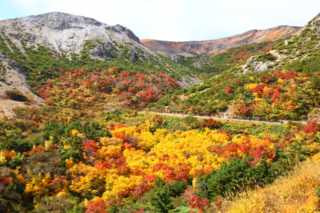山肌を覆う赤や黄色のグラデーションは、まるで絵画のような美しさです。