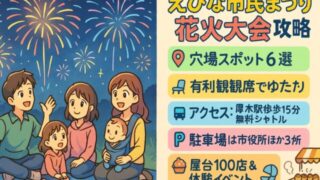 イベント えびな市民まつり花火大会2025 穴場スポット6選と有料席・アクセス徹底ガイド 「えびな市民まつり花火大会に行きたいけど、混雑が心配…」そんな方に向けて、この記事では穴場スポット6選を中心に、有料観覧席、アクセス方法、駐車場、シャトルバス情報までを徹底解説します。会場近くで迫力を楽しめるスポットから、子連れでも安心でき... イベント