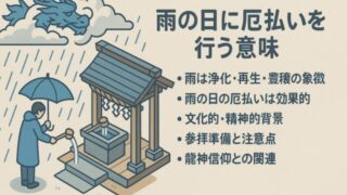イベント 雨の日の厄払いは特別?浄化とご利益の理由を徹底解説 本記事では「雨の日に厄払いを行う意味」について詳しく解説していきます。古来より日本人は自然現象に深い信仰心を抱いてきましたが、その中でも雨は特別な存在でした。雨はただの気象現象ではなく、浄化・再生・豊穣といった象徴を持ち、古来の人々の暮らし... イベント