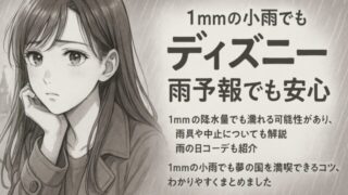 イベント ディズニーで「降水量1mm」は傘が必要?実際の体感と対策を徹底解説 ディズニーへ行く予定の日に「降水量1mm」と聞くと、「少しの雨なら大丈夫かな?」と思ってしまいますよね。でも、実際のところ1mmの雨でも、ディズニーのように屋外を歩き回る場所では思った以上に濡れることがあります。この記事では、ディズニーでの... イベント