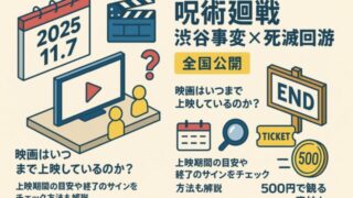 イベント 映画『呪術廻戦 渋谷事変×死滅回游』いつまで上映?終了時期・見逃さないコツを徹底解説 2025年11月7日より全国公開された『呪術廻戦 渋谷事変×死滅回游』。第2期「渋谷事変」を劇場用に再編集し、さらに第3期「死滅回游」の第1話・第2話を先行上映するという豪華構成で、公開前から話題を集めています。しかし、気になるのは「映画は... イベント