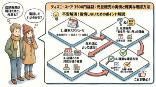 暮らし ディズニーストア福袋3500円は元旦も買える?例年の傾向と確実な確認方法を解説 年末年始が近づくと、ディズニーストアの福袋について気になり始める方は多いのではないでしょうか。中でも3500円の福袋は手に取りやすい価格帯で人気が高く、「店頭販売は明日だけど、元旦にも売るの?」「例年あると聞いたけど本当?」といった疑問を持... 暮らし
