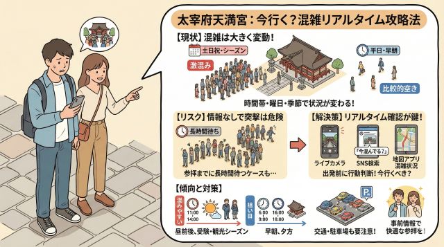 太宰府天満宮へ参拝や観光に行く予定があるものの、「今どれくらい混んでいるのか」「行ってもスムーズに参拝できるのか」と気になっている人は多いのではないでしょうか。
