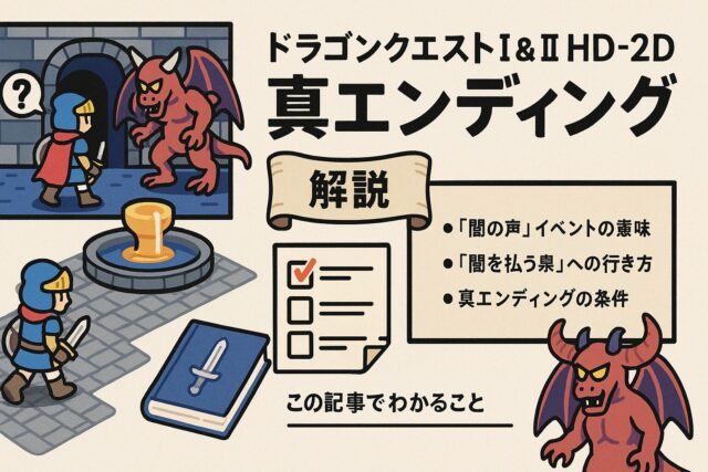 ドラクエ1&2 HD-2Dで真エンディングを迎えるためには、通常のエンディング後に出現する“闇の声”イベントを正しく進行させる必要があります。多くのプレイヤーが混乱するのは、このイベントが従来の流れとは異なり、明確な目的地やガイドが表示されない点です。特に「竜王のひ孫」の発言内容や「闇を払う源泉物」という抽象的な指示が、物語の核心を示しているにもかかわらず、具体的な行動が見えにくい構成になっています。そのため、真エンディングに到達するには、過去作の知識とシリーズのテーマ理解が鍵となります。ここでは、シドー撃破後のイベントから順を追って、真のエンディング条件を整理していきます。