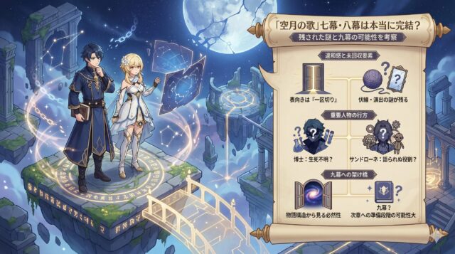 この記事では、七幕八幕の構成や演出を丁寧に振り返りながら、「空月の歌は本当に完結したのか」「続きはあるのか」という疑問に対して、物語構造の視点から考察していきます。公式に明言されていない部分についても、これまでの魔神任務の傾向や演出意図をもとに、無理のない範囲で整理しています。