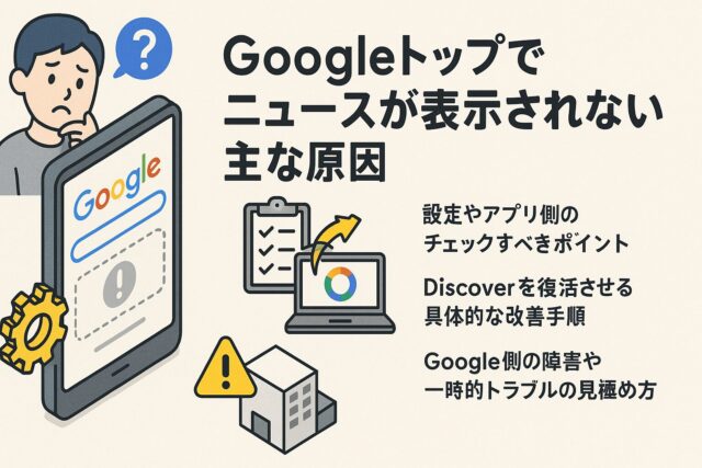 Googleを開いたときに普段は表示されているはずのニュース欄が、ある日突然見えなくなってしまうと不安になりますよね。設定を変えた覚えがなくても、Googleアプリやブラウザの状態、Discover設定の反映不具合など、さまざまな要因でニュースが一時的に表示されなくなることがあります。この記事では、よくある原因とチェックポイント、そして具体的な改善方法までをわかりやすくまとめています。初めての方でも手順通りに確認すれば復旧できる内容になっていますので、ぜひ参考にしてみてください。