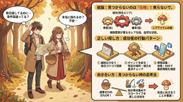 精神的な面で最も大切なのが、「見つからなくてもおかしくない」という前提を持つことです。まつたけはレアアイテムとして設計されているため、見つからない期間が続くのは異常ではありません。それにもかかわらず、「自分だけ出ていないのでは」「何か条件を逃しているのでは」と考え始めると、楽しさよりも不安が勝ってしまいます。