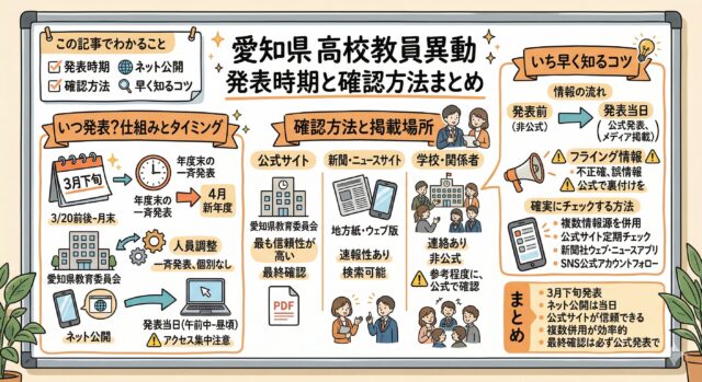 愛知県の高校教員の異動情報は、毎年3月になると多くの人が気にする重要な話題です。しかし、「いつ発表されるのか分からない」「ネットではいつ見られるの?」と疑問に思う方も多いのではないでしょうか。特に保護者や受験生にとっては、できるだけ早く正確な情報を知りたいところです。この記事では、愛知県の高校教員異動の発表時期や確認方法、さらにいち早く情報をチェックするコツまで分かりやすく解説します。