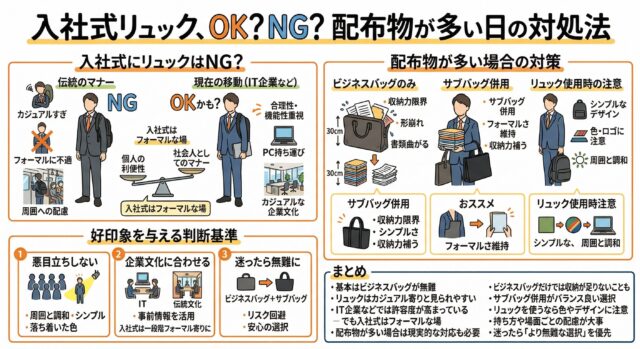 入社式において最も重要なのは、「周囲からどう見られるか」という視点です。ここでは個人の利便性よりも、社会人としての第一印象や礼儀が優先されます。そのため、多少不便であっても無難な選択をすることが基本となります。ただし、今回のように配布物が多いことが事前に分かっている場合は、実用性とのバランスを取る必要があります。この場合は、リュック単体で参加するのではなく、ビジネスバッグと併用するなど、「フォーマルさを保ちながら実用性を補う」工夫が重要になります。