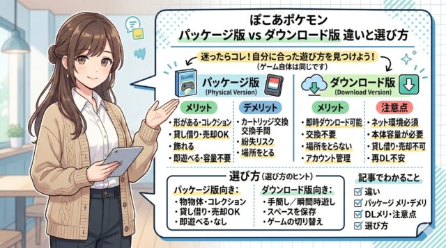 この記事では、ぽこあポケモンを購入するときに迷いやすい「パッケージ版とダウンロード版のどちらを選べばよいのか」という疑問について解説します。どちらの購入方法でもゲーム自体は同じように遊べますが、使い勝手や管理方法には違いがあります。事前にそれぞれの特徴を知っておくことで、自分の遊び方に合った購入方法を選びやすくなります。