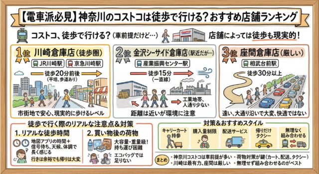 しかし、店舗によっては徒歩でも現実的に行ける場所もあり、選び方次第で快適に利用することも可能です。この記事では、神奈川県内のコストコについて「徒歩で行きやすいかどうか」という視点で徹底解説していきます。