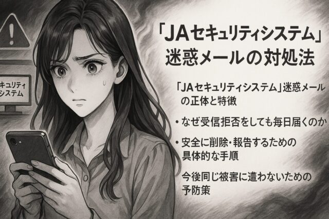 迷惑メールの中でも最近特に報告が増えているのが、「JAセキュリティシステム」を名乗るメールです。毎朝同じ時間に届くことも多く、不気味に感じる人も少なくありません。受信拒否をしても止まらないその正体は、一体何なのでしょうか? 本記事では、メールの仕組みや危険性、そして安全に対処するための具体的な方法を、初心者にもわかりやすく解説します。