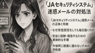 IT JAセキュリティシステムからの迷惑メールがしつこい!安全な対処法まとめ 迷惑メールの中でも最近特に報告が増えているのが、「JAセキュリティシステム」を名乗るメールです。毎朝同じ時間に届くことも多く、不気味に感じる人も少なくありません。受信拒否をしても止まらないその正体は、一体何なのでしょうか? 本記事では、メー... IT
