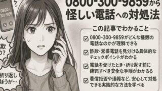 着信 0800-300-9859はどこから?正体と危険性を徹底調査 知らない番号「0800-300-9859」から突然電話がかかってくると、不安になりますよね。「詐欺なのでは?」「折り返したほうがいいの?」と疑問を抱く方も多いでしょう。実際、0800番号は企業の正規営業で使われる一方で、勧誘や悪質な営業にも... 着信