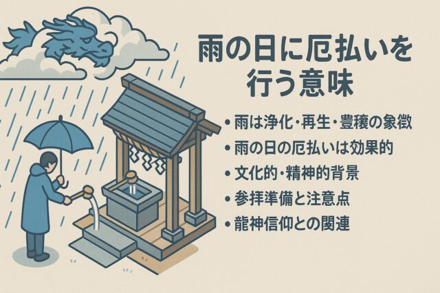 本稿では、雨の日に厄払いがなぜ良いとされるのか、その背景にある文化的・精神的な意味を紹介するとともに、実際に参拝する際の準備や注意点、さらには龍神信仰との関連まで幅広く取り上げます。