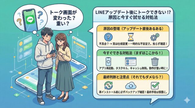 LINEをアップデートした直後に「トーク画面が変わって使いにくい」「動作が重くてトークできない」と感じる人は少なくありません。しかし、その多くは不具合ではなく、画面仕様の変更やアップデート直後の一時的な不安定さが原因です。LINEは定期的にUIや機能を更新しているため、正しい操作場所や対処法を知っていれば、慌てる必要はありません。この記事では、原因の整理から今すぐできる対処法、最終判断の目安までを分かりやすく解説しています。