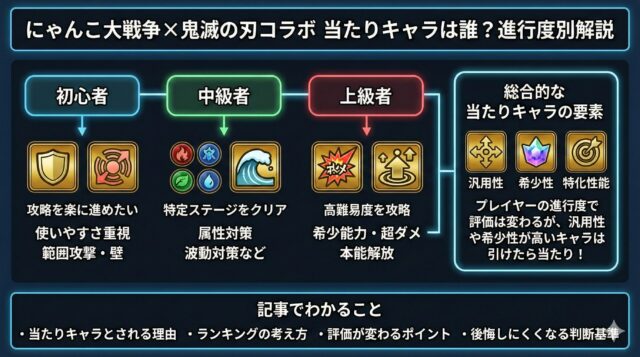 にゃんこ大戦争の鬼滅の刃コラボでは、毎回「誰が当たりキャラなのか?」と話題になります。結論から言うと、プレイヤーの進行度によって評価は変わるものの、総合的に見て「引けたら当たり」と言われやすいキャラは存在します。本記事では、ネット上の評価や使われ方を整理しながら、なぜそのキャラが当たりとされるのか、また初心者・中級者・上級者それぞれの立場で当たりの考え方がどう変わるのかを解説してきました。鬼滅の刃コラボガチャを引くか迷っている人や、すでに引いた結果をどう受け止めればいいか悩んでいる人にとって、判断材料になる内容です。