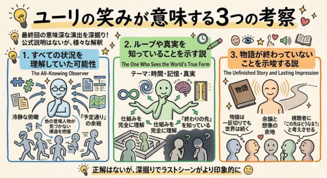 ユーリの意味深な笑みは、物語が終わったあとも視聴者の中で考察を続けさせるための、印象的なラスト演出だったと言えるでしょう。
