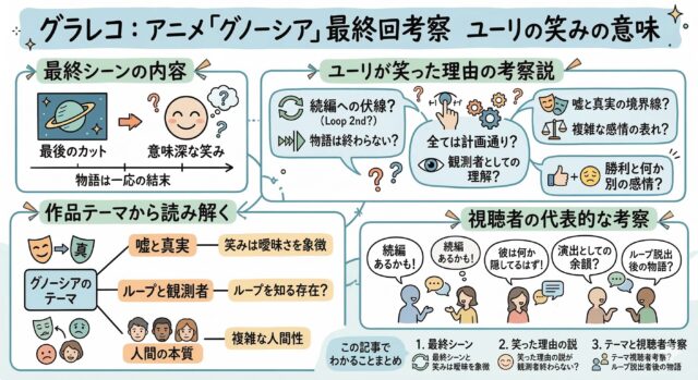 アニメ「グノーシア」最終回のユーリの笑みは、作中でも特に印象的なラスト演出として多くの視聴者の間で話題になりました。明確な説明がないため様々な解釈が生まれていますが、その曖昧さこそが作品のテーマとも深く関わっています。ここでは今回解説してきたポイントを整理しておきます。