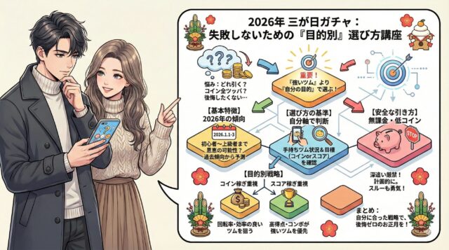 ここでは、コイン稼ぎ・スコア稼ぎ・初心者向けという3つの視点から、三が日におすすめできるガチャの考え方を整理していきます。自分に合った基準を見つけることで、無駄なコイン消費を防ぎ、満足度の高い結果につながります。