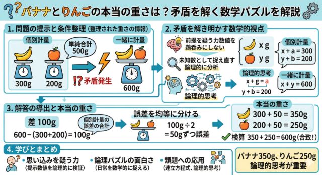 この問題では、バナナが300g、りんごが200gという情報をそのまま受け入れてしまうと、正しい答えにたどり着くことができません。合計が600gになるという条件との矛盾に気づくことで、初めて問題の本質が見えてきます。数学においては、与えられた数値や前提を無条件に信じるのではなく、論理的に検証する姿勢が重要です。このような思考習慣は、問題解決能力を高めるだけでなく、日常生活における判断力の向上にも役立ちます。