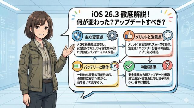 iOS 26.3は、大きな新機能追加というよりも、安定性やセキュリティ強化を中心としたアップデートです。「何が変わったの?」「アップデートすべき?」と気になっている方に向けて、変更点・メリット・注意点・判断基準までわかりやすく整理しました。