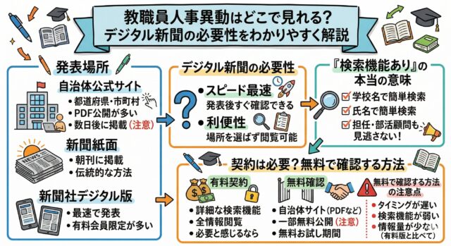 この記事では、教職員人事異動の確認方法からデジタル新聞の必要性まで、わかりやすく整理して解説していきます。