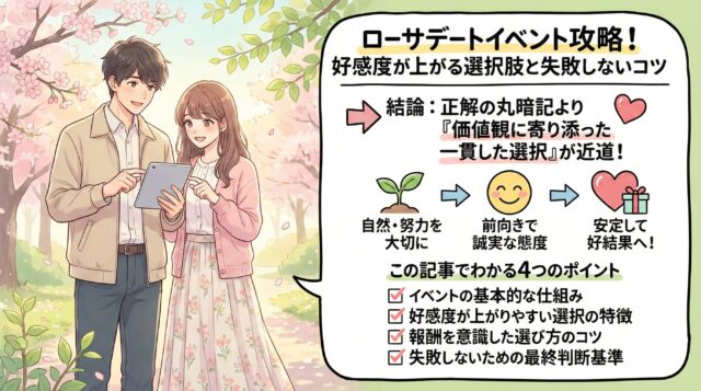 ローサデートイベントの攻略は、特別なテクニックよりも“理解と一貫性”が鍵です。キャラクターを尊重し、安定した選択を積み重ねることが、最終的な成功へとつながります。