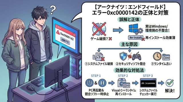 PCで「アークナイツ:エンドフィールド」を起動しようとした際に、0xc0000142という見慣れないエラーが表示されると、「ゲームが壊れているのでは?」と不安になります。しかし、このエラーの多くはゲーム自体の問題ではなく、WindowsやPC環境側の不整合が原因で発生しています。再インストールや整合性確認を何度試しても直らないのは、そのためです。この記事では、0xc0000142エラーの正体を整理したうえで、実際に改善につながりやすい原因と対処法を分かりやすく解説しています。